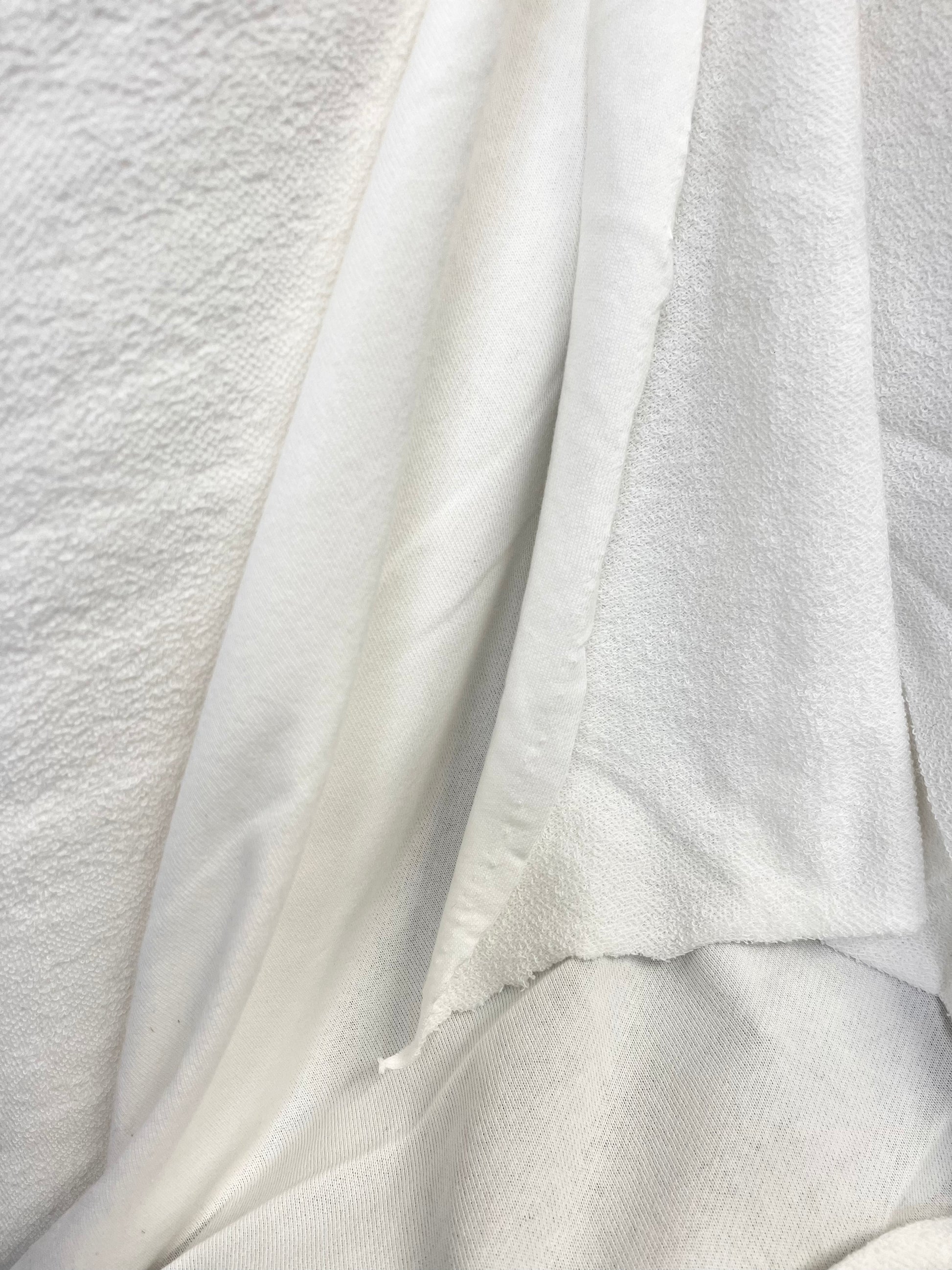This is french terry, in a slight off white/ivory color. This terry is a light/medium weight with a soft feel on the jersey side and a dry textured terry side. Make a hoodie, lounge pants or get creative with this fabric! This fabric features a slight stretch throughout.