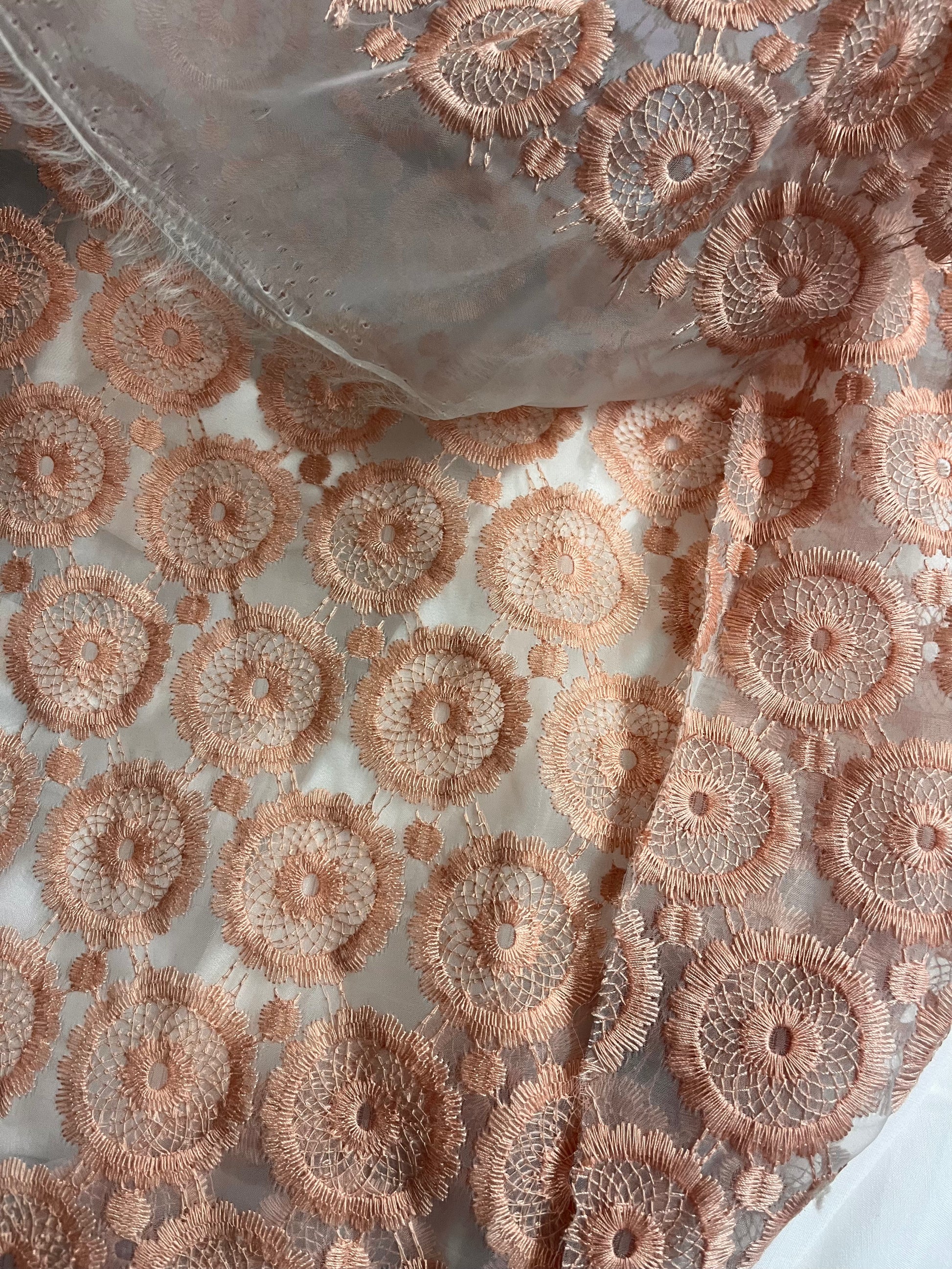 This is a one-of-a-kind poly organza! Embroidered with circle motifs in a soft peach thread. This fabric is great for special occasion apparel & home decor!