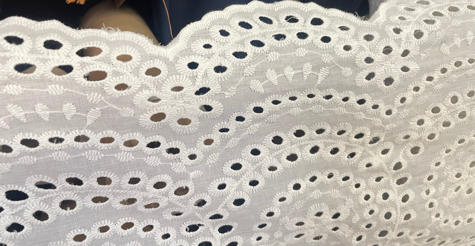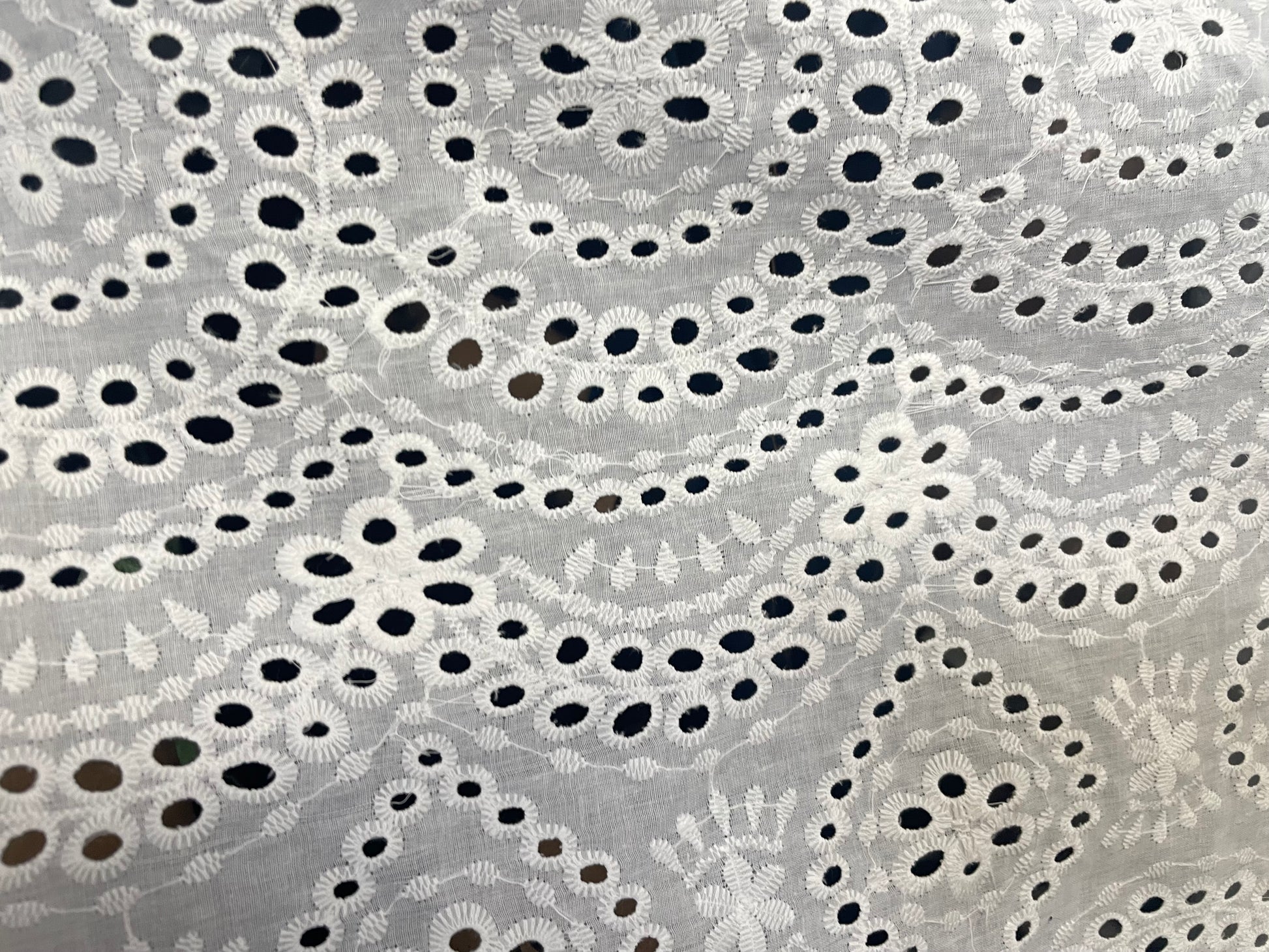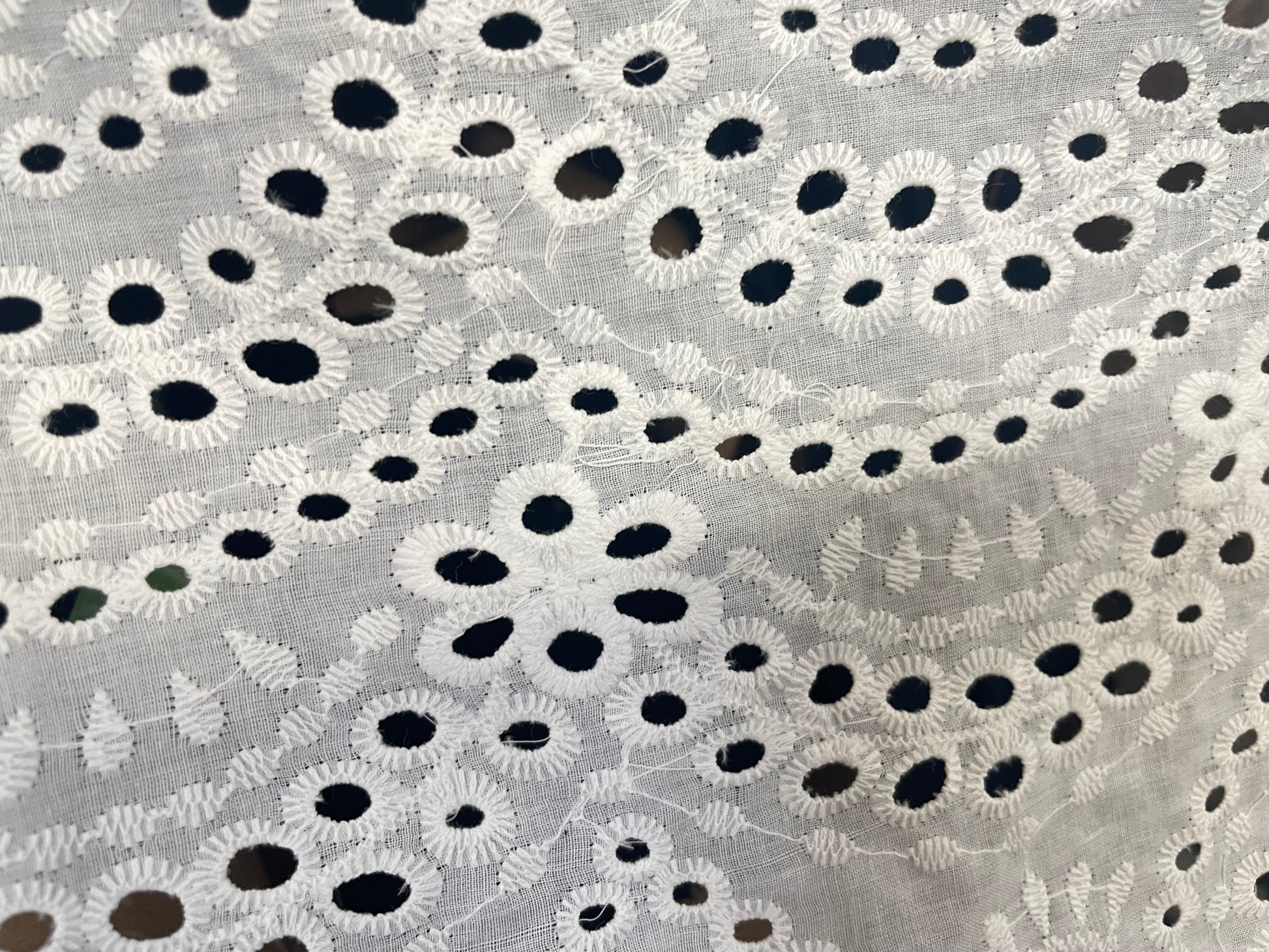 This is a pretty eyelet embroidered cotton. This cotton fabric is very versatile and can be dyed to the exact color you need! It makes for an ideal fabric for spring or summer dresses, frocks, shirts and tops.