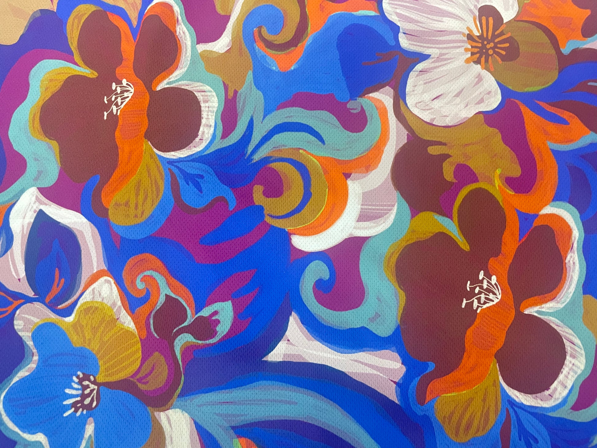 This is a textured poly jersey, printed with an abstract floral pattern. Blue, purple & teal flowers flow together with white highlights. This fabric is a great choice for comfy clothes and slinky dresses & form fitting tops