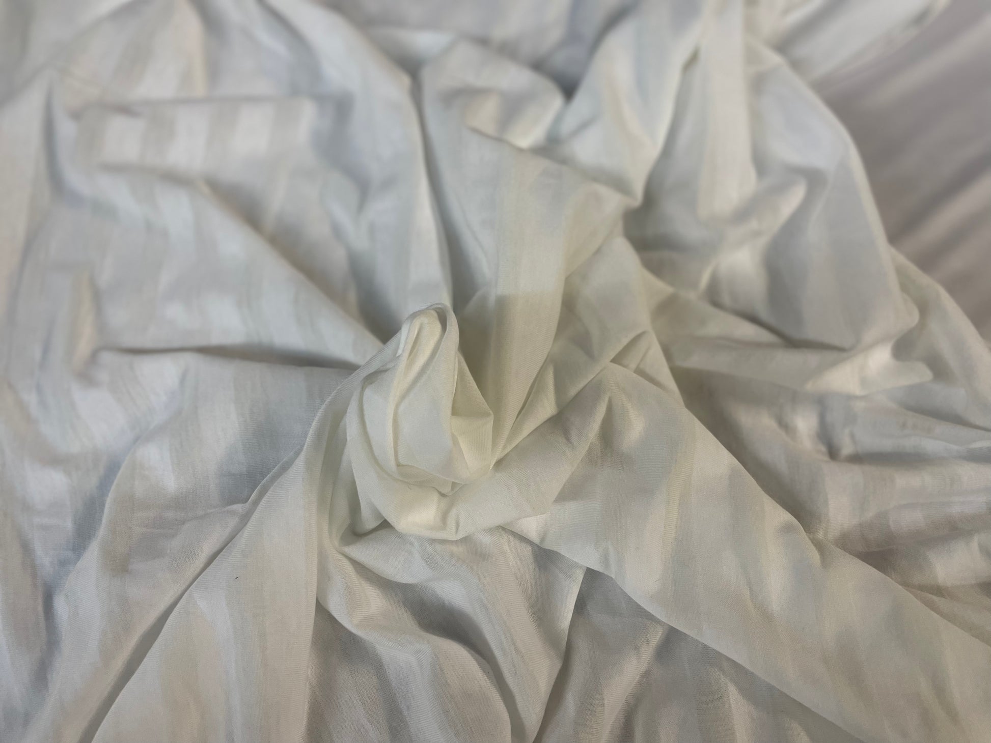 Alternating white and off-white stripes on this lightweight, soft and stretchy jersey. Good quality and very comfortable, perfect for a variety of projects. Great for a dress, top, pants, and more.