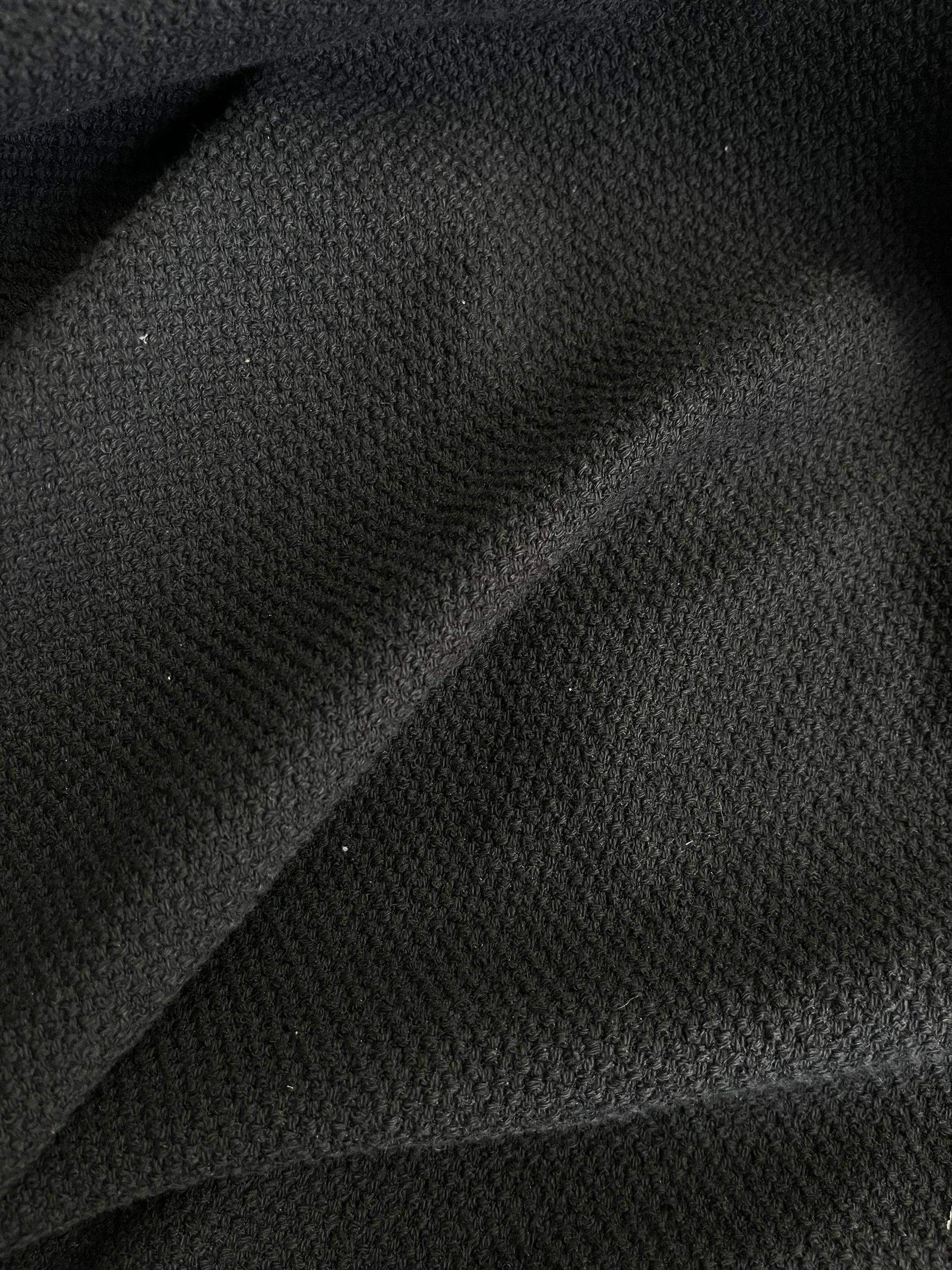 This is a woven cotton boucle in a black color. It has a basket weave texture. This fabric is great for statement pieces in your closet! Use for a chic coat or jacket or a fun matching set!