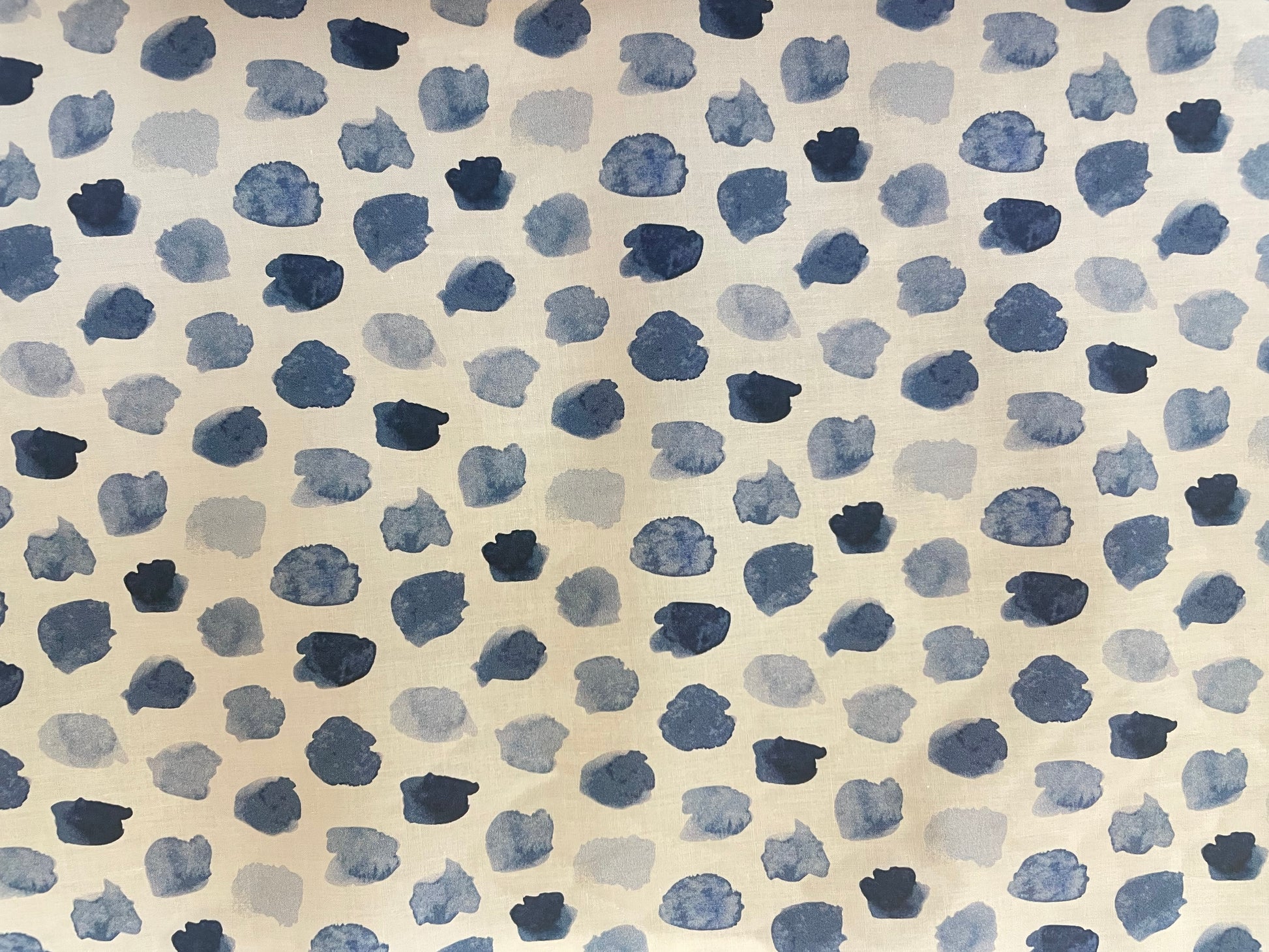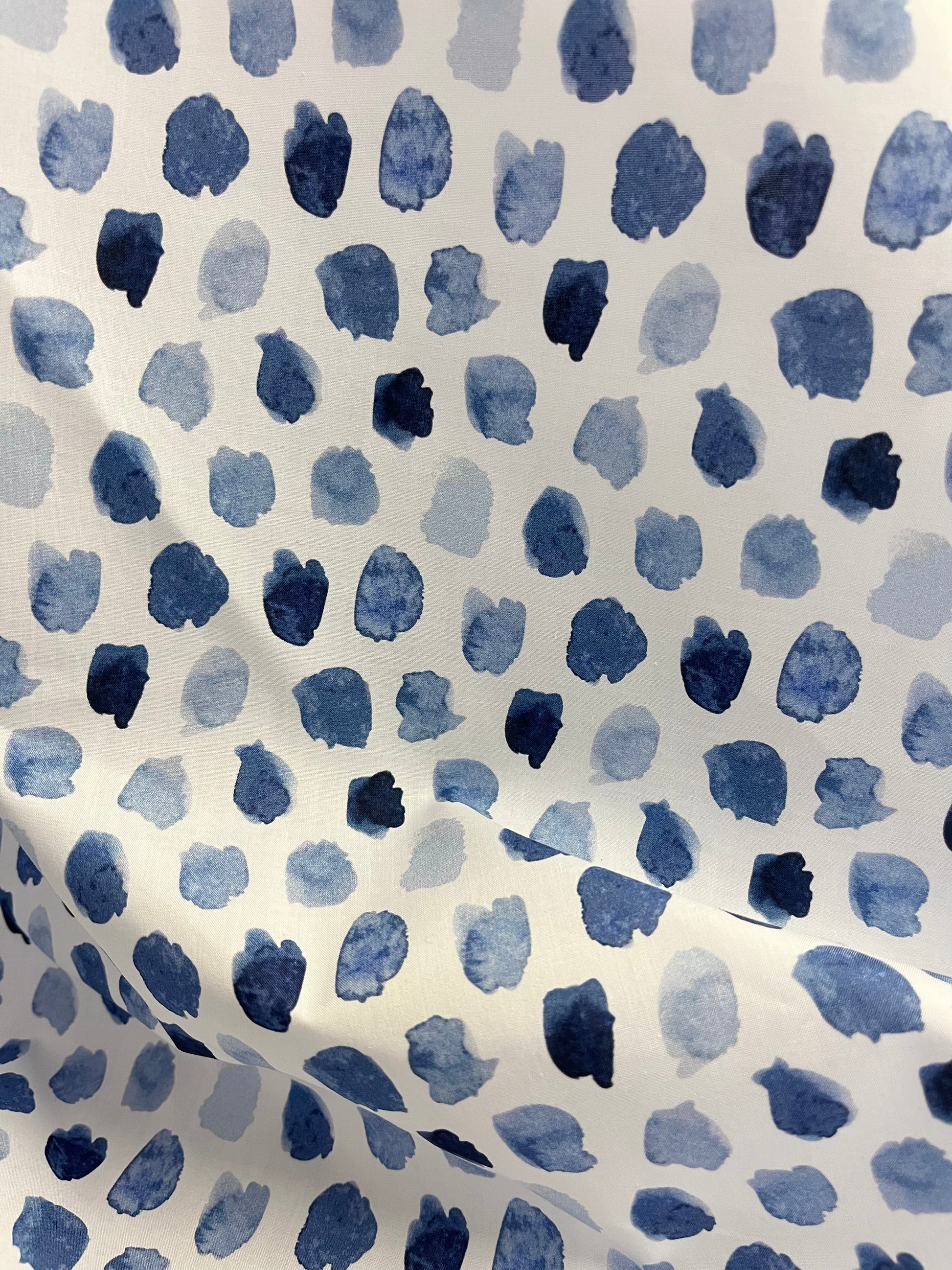 Imported from Italy, this is whimsical printed cotton. Irregular watercolor polka dots are printed on a bright white cotton with varying shades of blue. Great for staying cool in hot weather, absorbent and breathable. Perfect for pants, dresses, skirts, jackets and many more sewing projects.