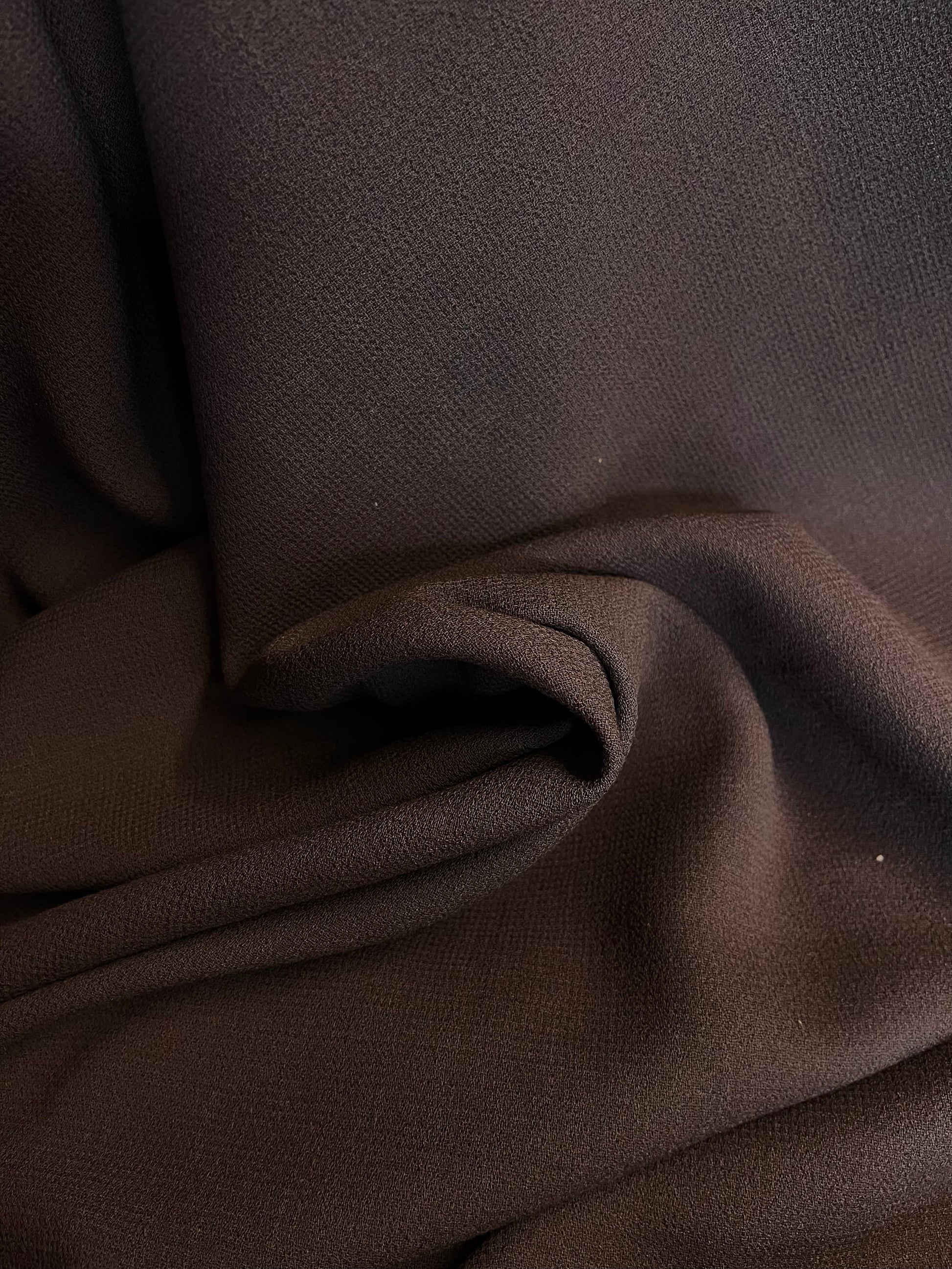 Imported from Italy, this is a double-faced virgin wool crepe in a custom designer warm brown color. This crepe offers some structure while also having good drape. With its beautiful texture and flattering fit this wool crepe would be great for skirts, dresses, pants, jackets & more.