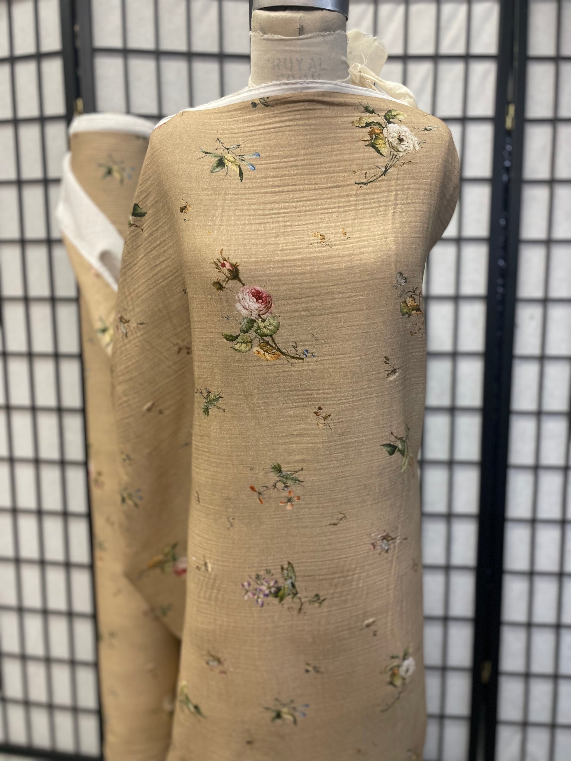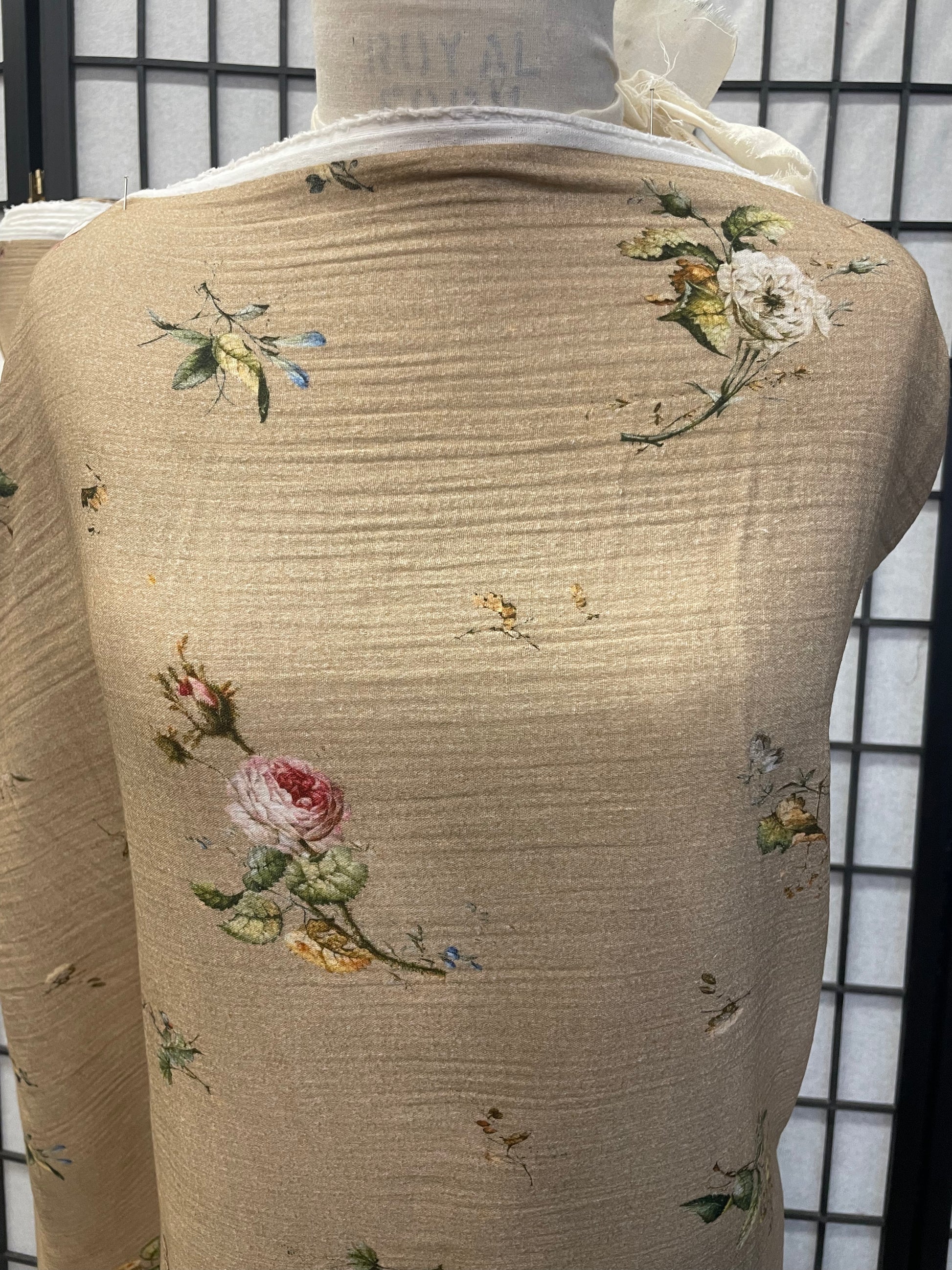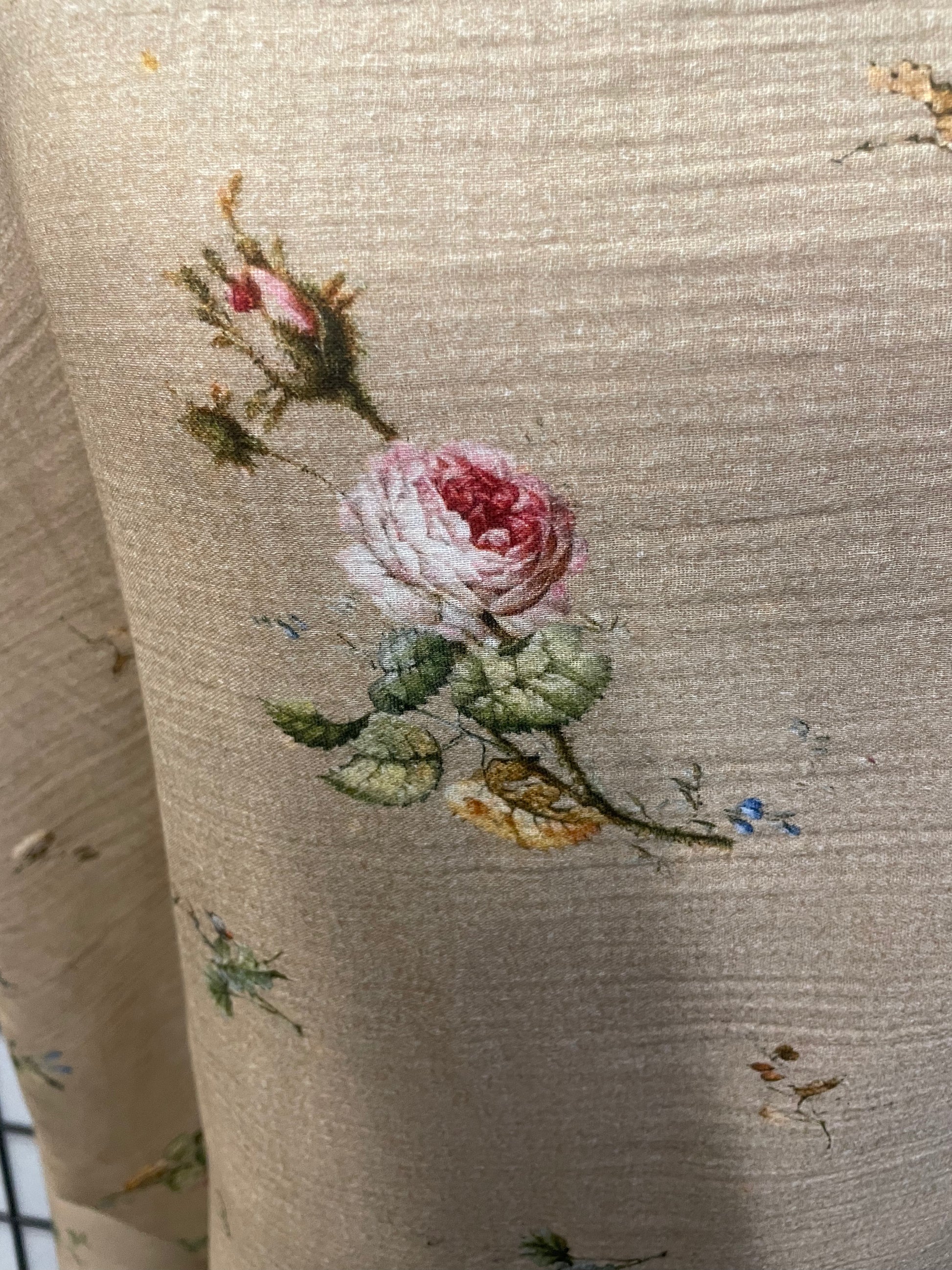 An Italian-made soft and lightweight, double-layered cotton printed with flowers in warm tones on Khaki. Good for making tops, pants, dresses, skirts and more.