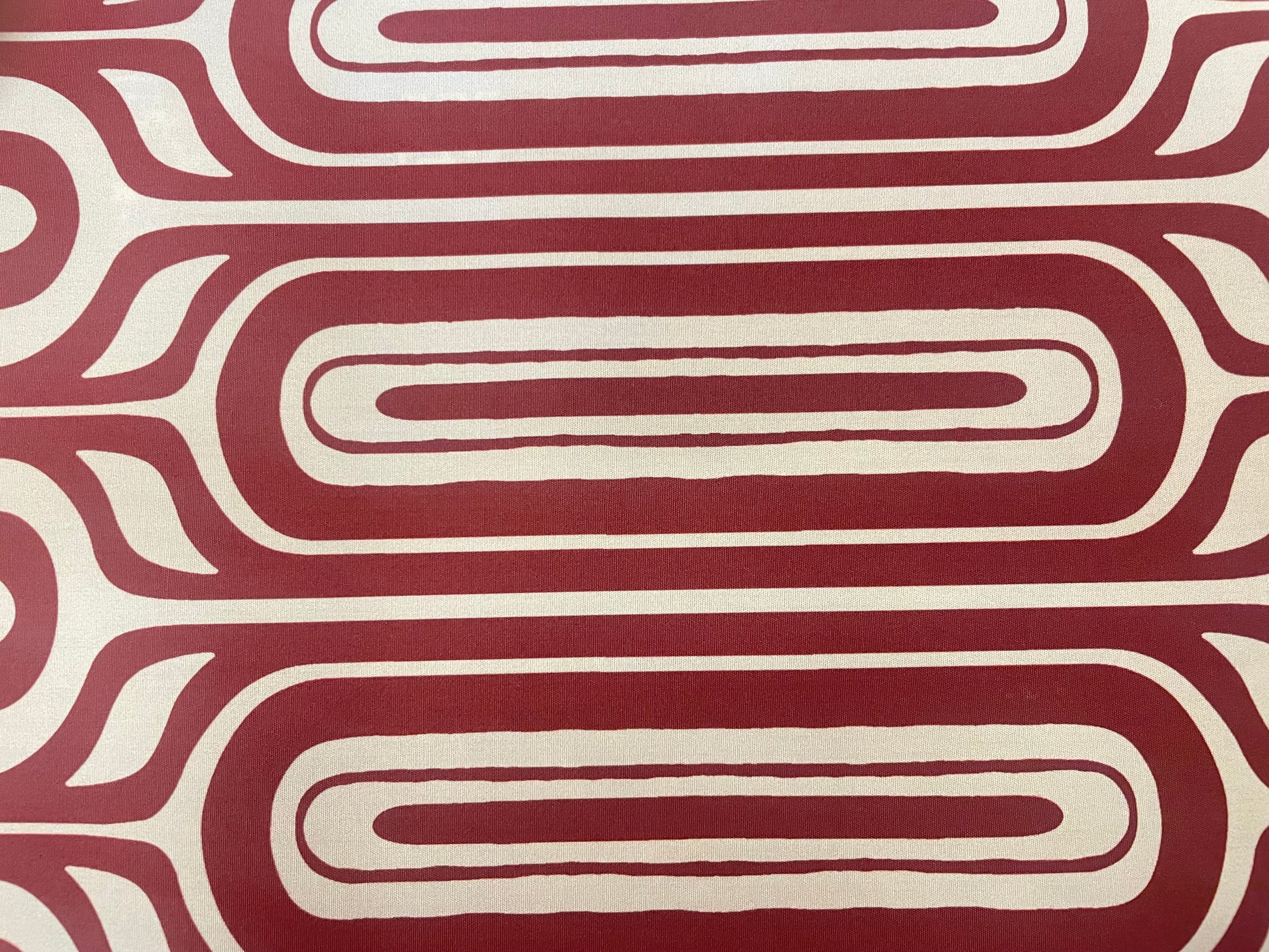 Imported from Italy, this printed cotton brings a fun vintage feel to any project! Featuring a large scale 70's mod style print, dark red motifs contrast on beige cotton. This fabric is perfect for making dresses, pants, skirts and jackets.