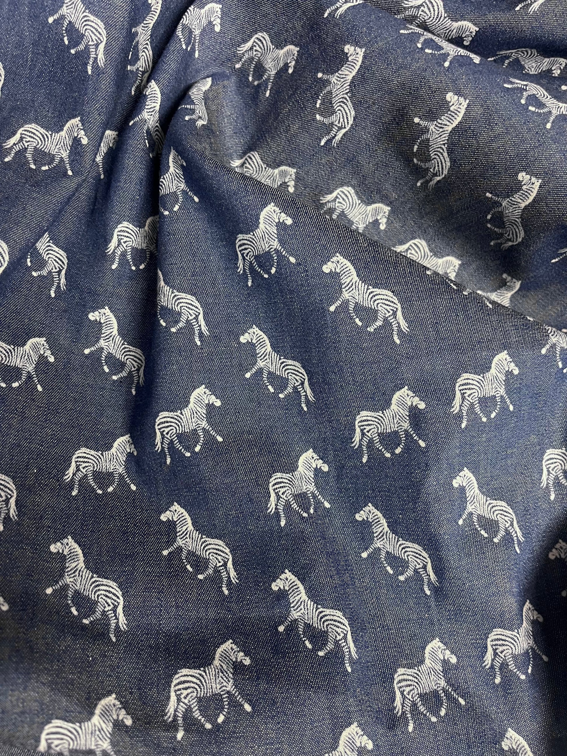 Imported from Italy, this is a luxury chambray. Printed with a small zebra repeat! This fabric is great for eclectic projects, perfect for making dresses, pants, skirts and jackets.