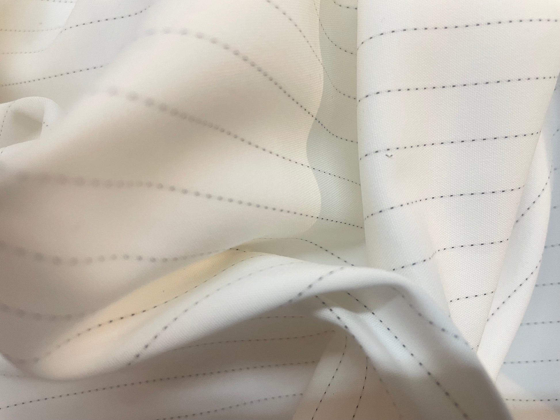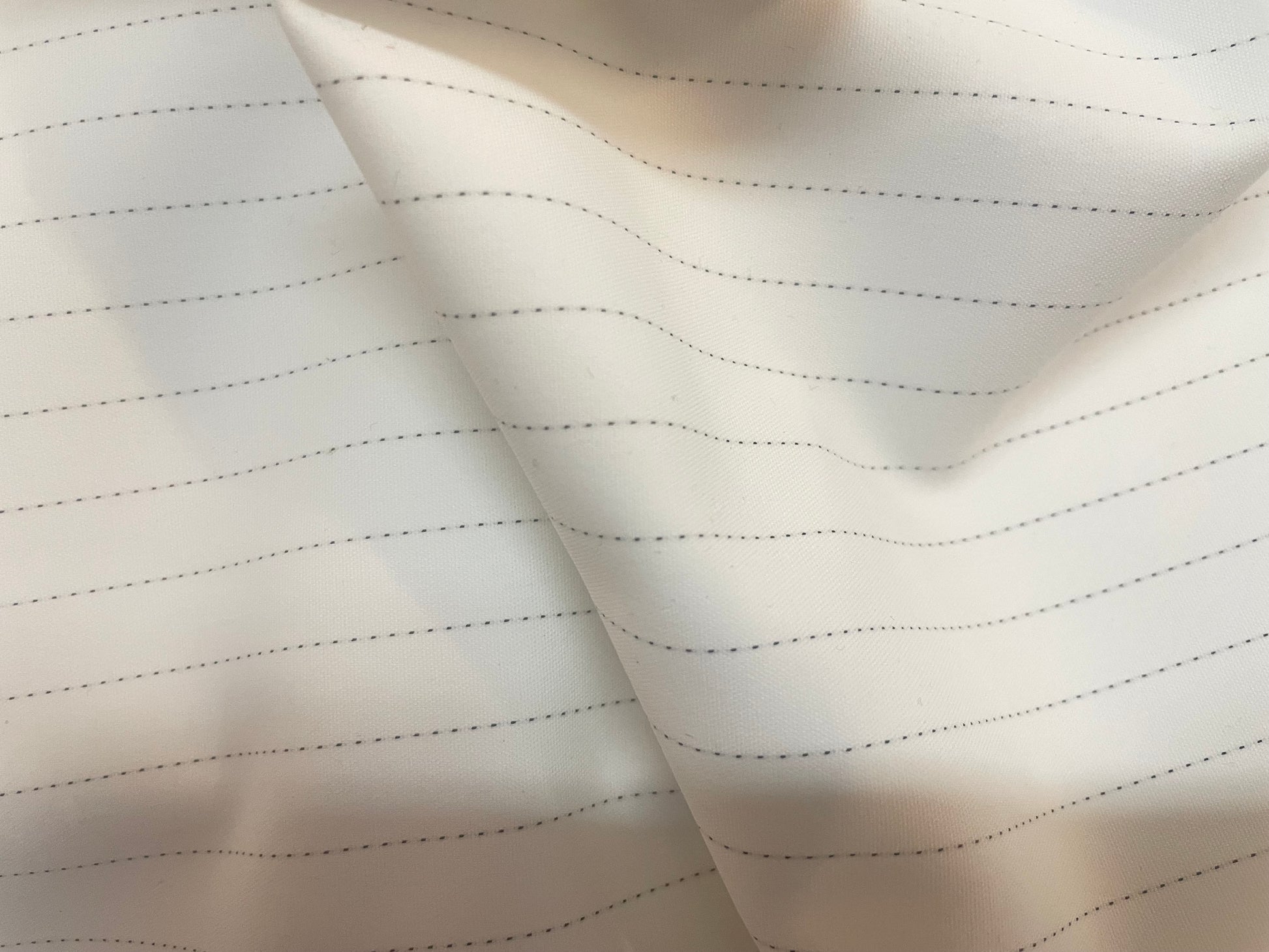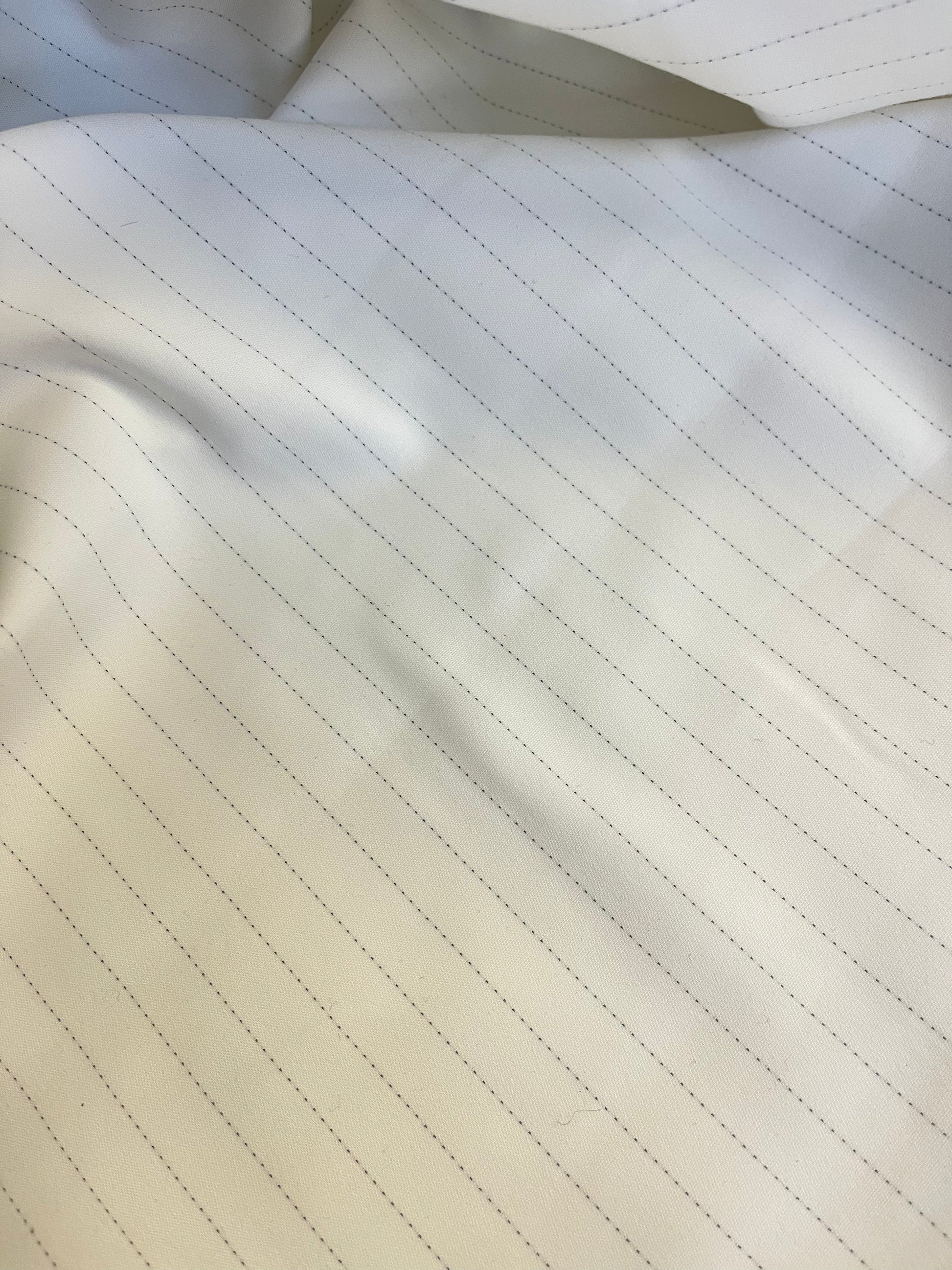 This is a versatile luxury stretch cotton stripe! Featuring a grey pinstripe on an ivory backdrop. This is the perfect fabric for comfortable workwear, modern summer looks & more!